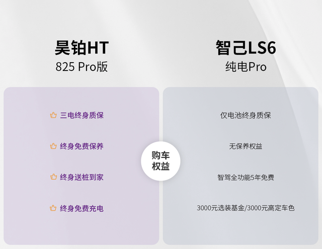 01 续航对决,保障出行自由如果你在节假日经常有带家人跨省旅行需求,那我会更推荐你认真考虑昊铂HT 825版。它的价格,这回跟智己LS6 纯电Pro相差无几了,终端价分别是19.99万和19.79万,但续航直接达到了825km,比智己LS6 Pro的650km多出175km,光是续航的优势,昊铂HT多2000元的价格,实际价值已经远超20000元了。